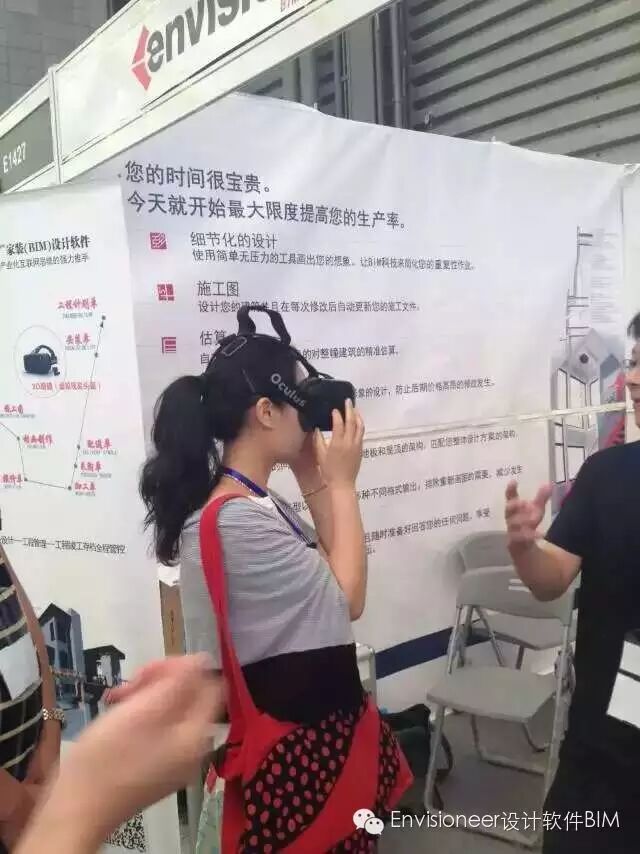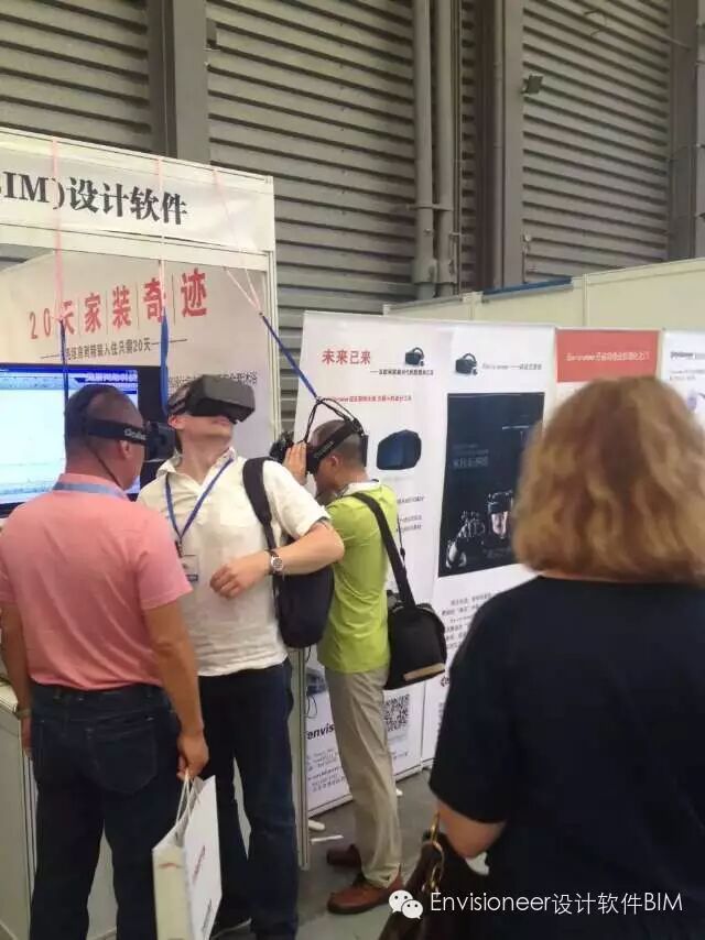 展会期间,还有一个小插曲。外国友人也来到Envisioneer展位前,看到oculus以后,认为是中国的造假能力太强了,国外的oculus还没发售,中国市场已经有了。经过了解后,才知道是测试版,是因为Envisioneer对接虚拟现实头盔,所以出现在我们的展位。他们很有兴趣的试戴了头盔,并对看到的虚拟样板间效果赞不绝口。