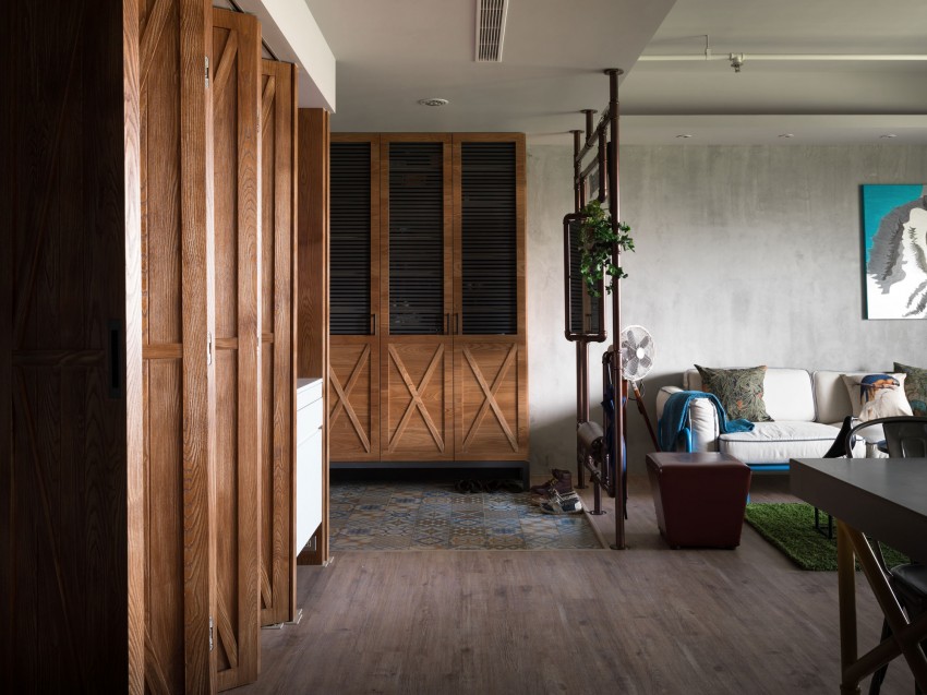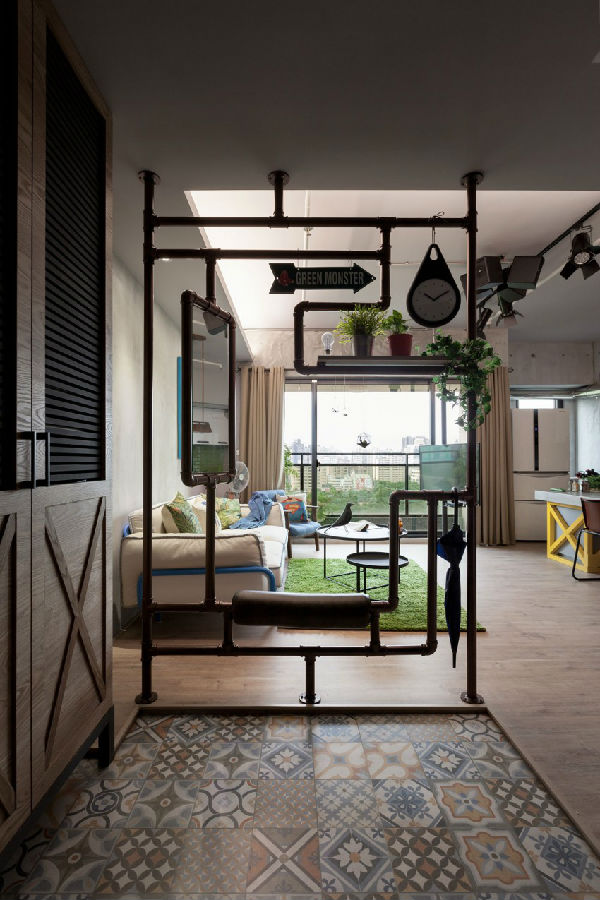 在这个案例中,墙的设计突出的是功能性和透光性。例如,将水管设成为分隔屏,显示出有趣的视觉效果。不同于国内屏风通常用于风水和储藏,这个水管分隔屏用来挂衣服和鞋,创建了一种居住的氛围。