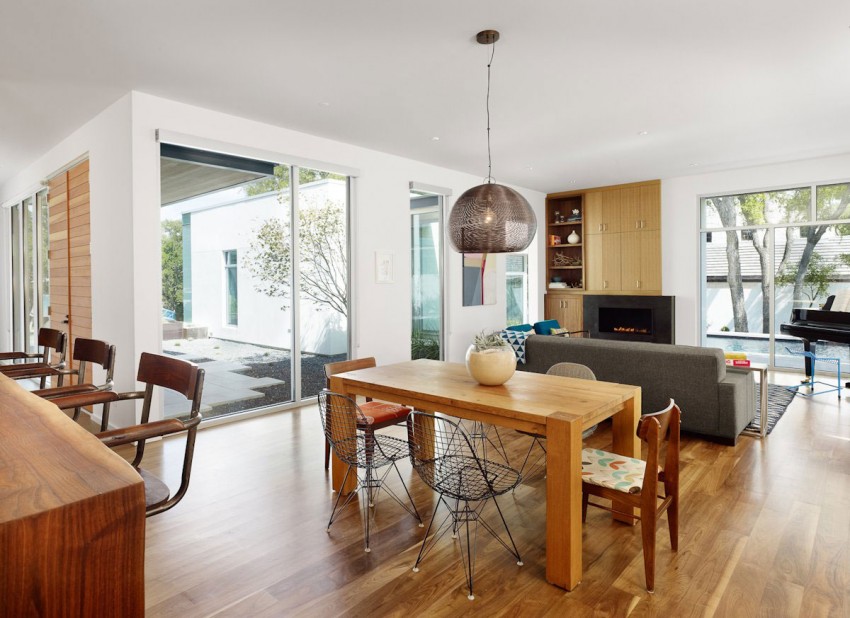 位于美国德州的西奥斯丁的3700平方英尺的住宅是一个四口之家的家。房间充斥着大量木材,白橡木镶板、橱柜,胡桃木地板,茶几,椅子都有很多木质材料。